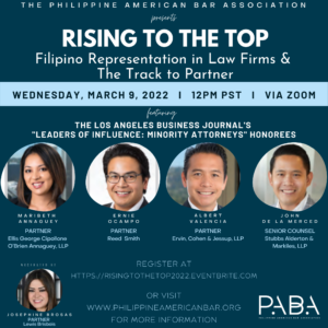 PABA proudly presents “RISING TO THE TOP: Filipino Representation in Law Firms & The Track to Partner” on March 9, 2022 at 12:00 p.m. (PST) via Zoom, featuring PABA members recently honored in The Los Angeles Business Journal’s “Leaders of Influence: Minority Attorneys.” Join us as our panelists discuss their track to Partner as Filipino-Americans.